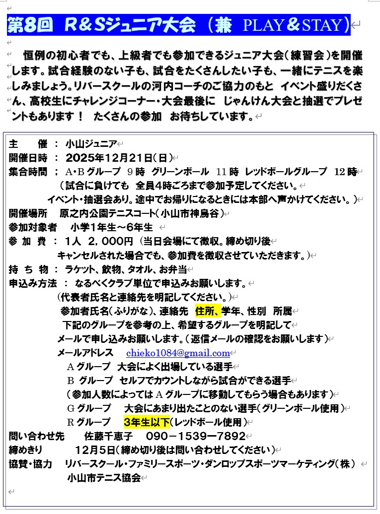 ニュース2025年10月31日R&Sジュニア大会のお知らせ ニュース2025年10月31日R&Sジュニア大会のお知らせ